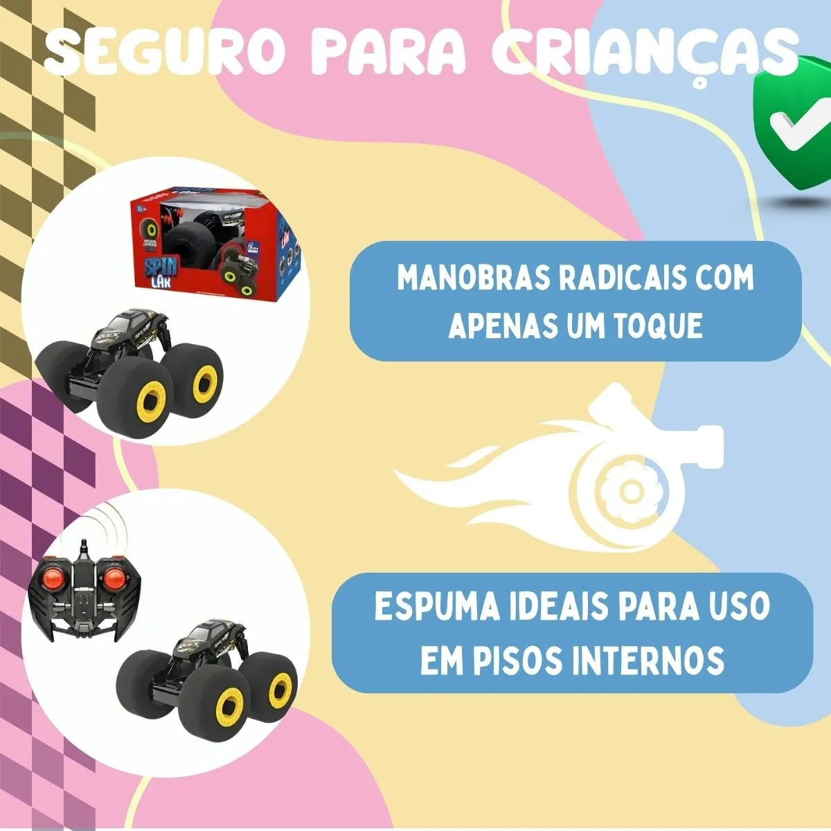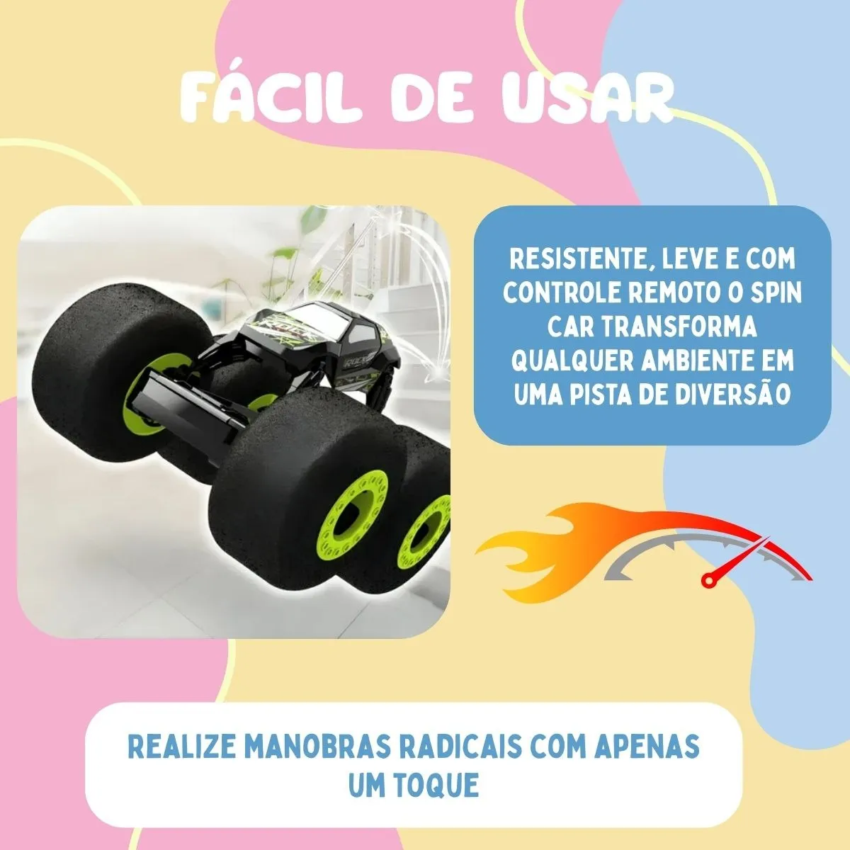 Resistente, leve e com controle remoto fácil de usar, o Spin Car transforma qualquer ambiente em uma pista de diversão!